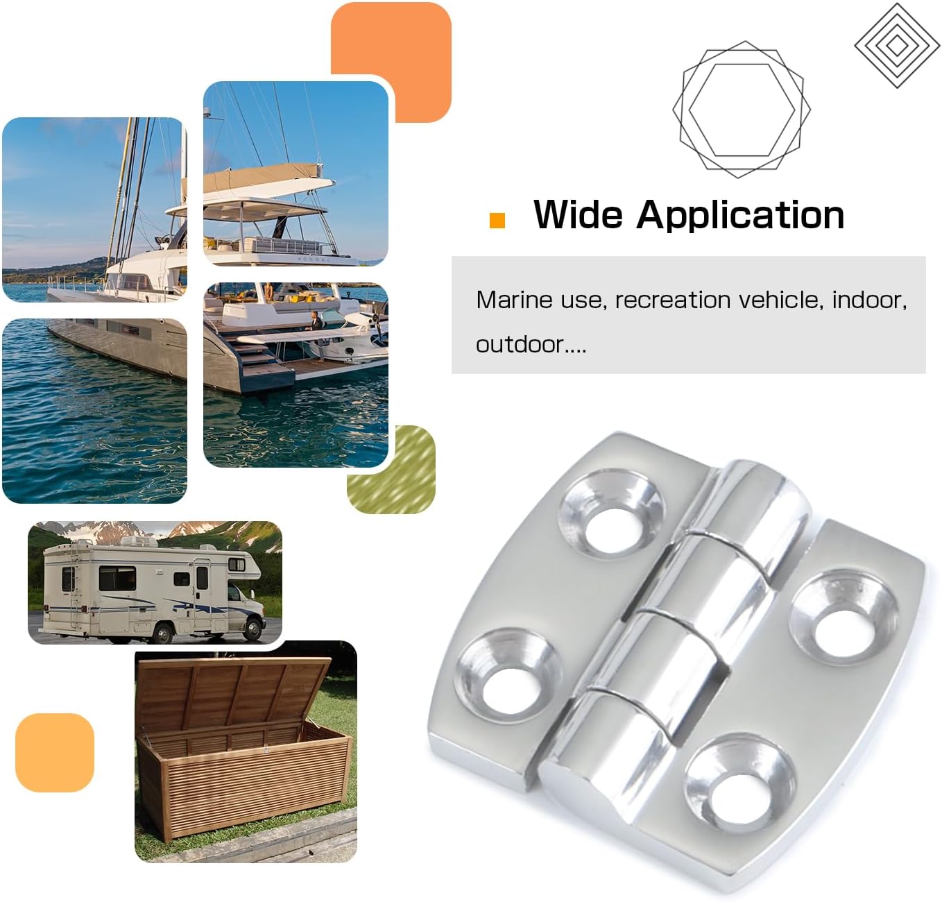 • Marine Grade Hinges : Considering for make better marine using experience for everyone,we use SUS316 to produce marine hinge steel.SUS316 material would do better on your marine trip using, it could provide convenience and reliability for your daily using. These stainless steel hinges can be used under hot and humid environment. Therefore,these boat hinges would especially perform well on marine usages.