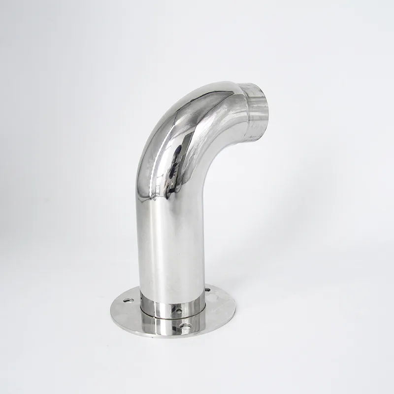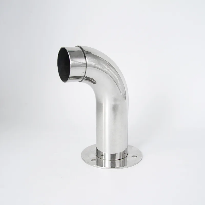 This component is used to attach a handrail with a diameter of 42.4 mm in situations where a 90-degree turn is required and the handrail needs to be secured to a wall. The handrail mounting features three holes for self-tapping screws with countersunk heads. The countersunk heads are flush with the flange and do not protrude. The outer diameter of the mounting component is 76 mm. The mounting part of the component is inserted into the tube and secured using a clip, welding, or glue.